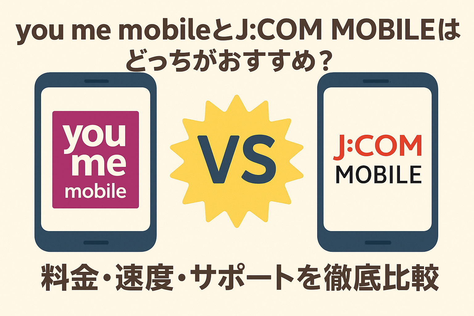 この記事では、you me mobileとJ:COM MOBILEという2つの格安SIMを、料金・速度・サポート・評判・キャンペーン・特典などあらゆる角度から徹底比較します。 「地方で使いやすいのはどっち?」「J:COMを契約していると本当にお得?」「速度は実際どうなの?... -