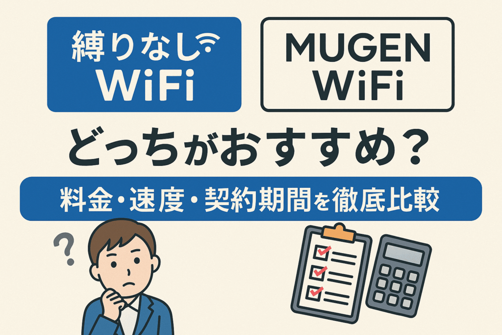 このページでは、縛りなしWiFiとMUGEN WiFiを料金・速度・契約期間などの主要ポイントで徹底比較し、あなたに最適なWiFiサービスを選べるようにわかりやすくまとめています。 短期向け・長期向けそれぞれのメリットを深掘りしながら、独自レビューも交えて... -
