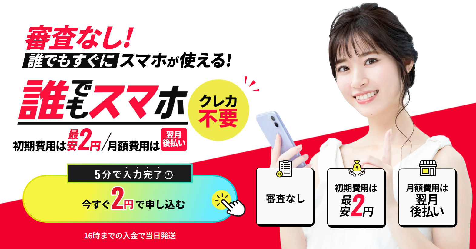 誰でもスマホは、「初期費用2円」「審査がゆるい」「料金が安い」という3つの強みで、他社よりも圧倒的に始めやすいスマホサービスです。